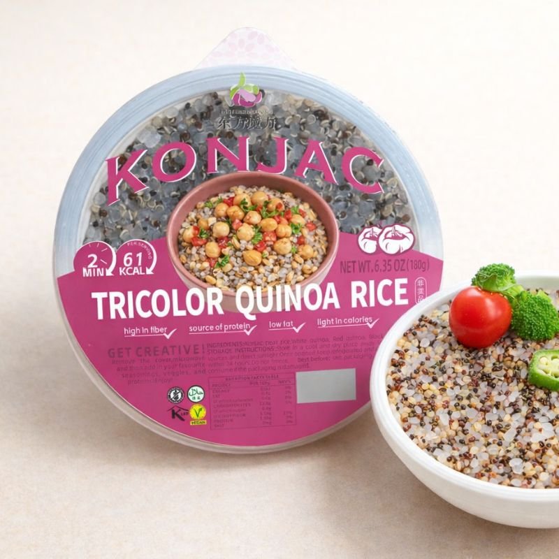 Tri-Color Quinoa Shirataki Rice is a functional plant-based grain alternative combining konjac rice with white, red, and black quinoa. This innovative blend provides a balanced nutritional profile with high dietary fiber from konjac and complete plant protein from quinoa.